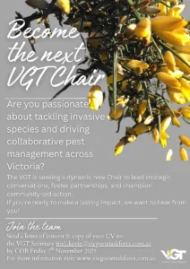 The Victorian Gorse Taskforce (VGT) is seeking a passionate and strategic leader to step into the role of Chair. This is a unique opportunity to guide the development of VGT’s new gorse strategy and help shape the future direction of community-led pest plant management across the state.